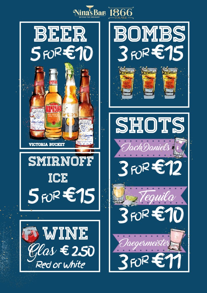 Check out our changing Special Offers Menu. Enjoy deals like five beers for ten euros, bombs three for fifteen, or five Smirnoff Ice for just fifteen euros. We also offer shot specials – for example Jack Daniel’s three for twelve, Tequila three for ten, or Jägermeister three for eleven. Or enjoy a glass of wine for only two-fifty.